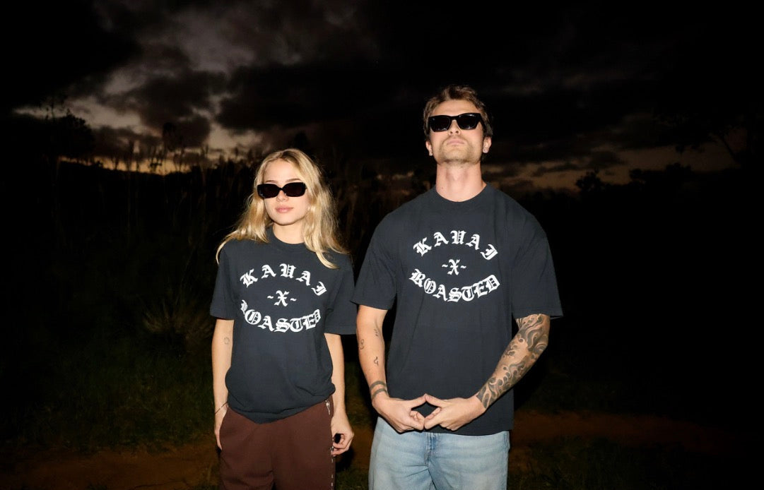 KAUAI x ROASTED on the front & JAVA KAI on the back of a sturdy, yet soft, 100% cotton t-shirt from Los Angeles Apparel.